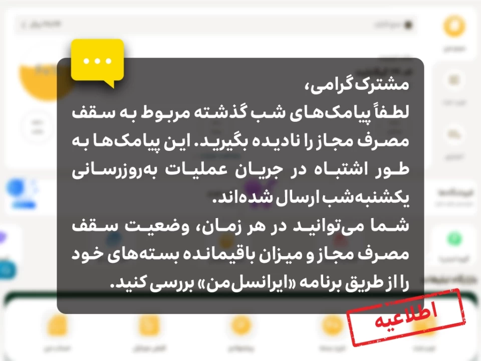 لطفاً پیامکهای شب گذشته مربوط به سقف مصرف مجاز را نادیده بگیرید. این پیامکها بهطور اشتباه، در جریان عملیات بهروزرسانی یکشنبهشب ارسال شدهاند.