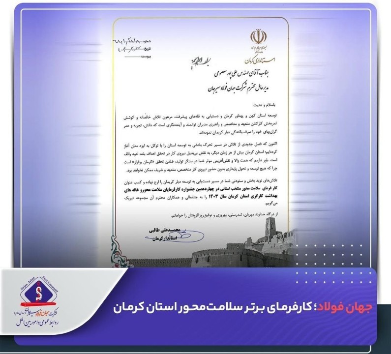 شرکت جهان فولاد سیرجان در راستای ارتقاء سلامت محیط کار و توجه به شاخصهای بهداشت و سلامت کارکنان، موفق به کسب عنوان ارزشمند “کارفرمای سلامتمحور” در سطح استان کرمان شد.