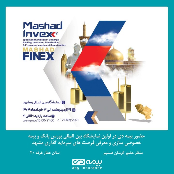 به گزارش روابط عموی بیمه دی، این شرکت با هدف گسترش تعاملات اقتصادی و معرفی ظرفیت‌ها و خدمات خود، در اولین نمایشگاه بین‌المللی بورس، بانک و بیمه با محوریت خصوصی‌سازی و معرفی فرصت‌های سرمایه‌گذاری، در شهر مشهد مقدس حضور خواهد داشت. این نمایشگاه از تاریخ 31 اردیبهشت لغایت 3 خرداد 1404 در محل نمایشگاه بین‌المللی مشهد برگزار می‌شود.