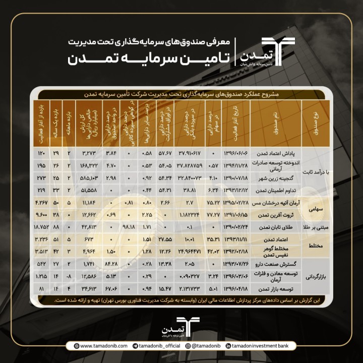 در جدول زیر مشروح عملکرد صندوق‌های سرمایه‌گذاری تحت مدیریت شرکت تأمین سرمایه تمدن را مشاهده می‌کنید.