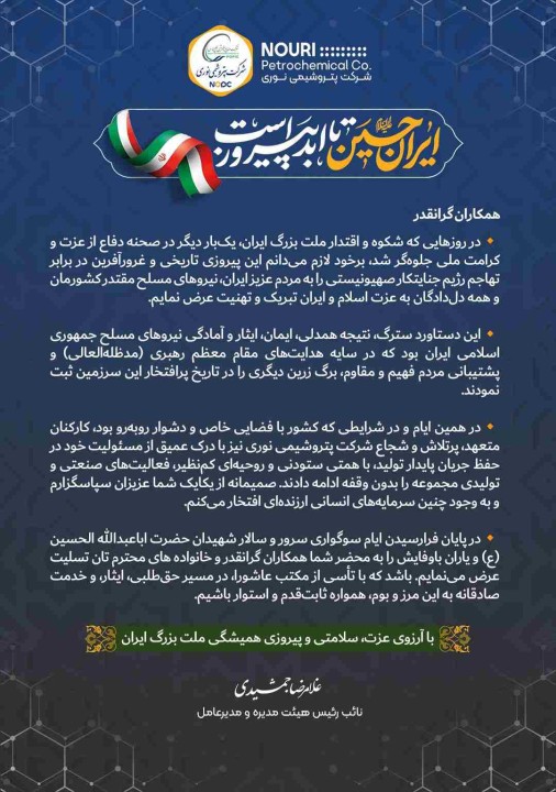 دکتر غلامرضا جمشیدی مدیرعامل شرکت پتروشیمی نوری در پیامی پیروزی بزرگ ملت ایران و حماسه پرافتخار نیروهای مسلح کشور را در دفاع از میهن عزیز و اسلامی ایران تبریک گفت.