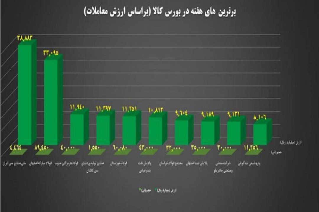 در هفته‌ای که گذشت، بازار فیزیکی بورس کالای ایران شاهد معامله بیش از دو میلیون تن انواع کالا به ارزش ۴۰/۴ هزار میلیارد تومان بود و ۱۰ شرکت برتر با مجموع ارزش‌فروش بیش از ۱۵/۳ هزار میلیارد تومان، نقش کلیدی در معاملات ایفا کردند.