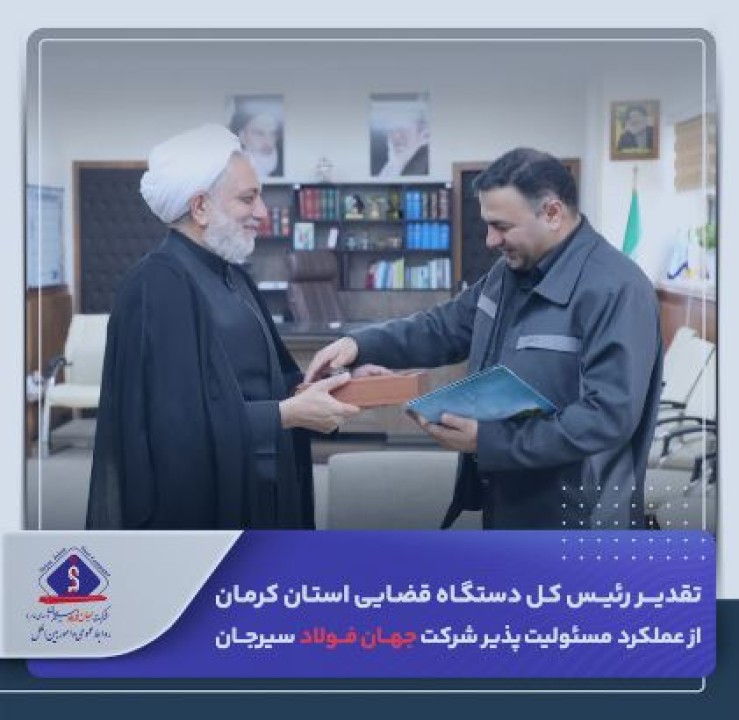 رئیس‌کل دستگاه قضایی استان کرمان با اهدای لوح سپاس از تلاش ها و اقدامات ارزنده شرکت جهان فولاد سیرجان، در عرصه‌های تولید، اشتغال‌زایی و نقش آفرینی مسئولانه در عرصه های اجتماعی ، قدردانی نمود.