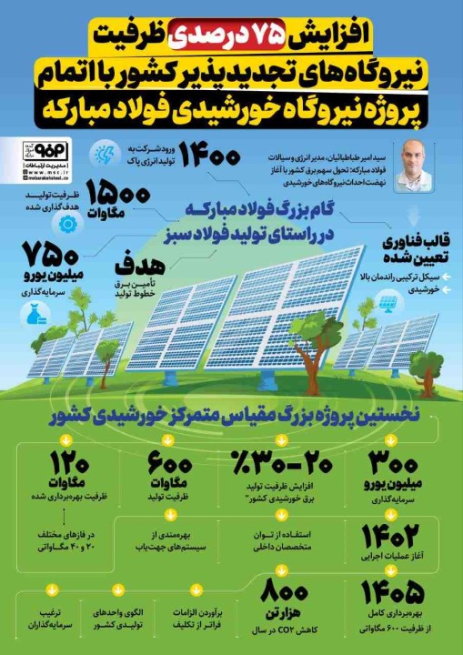ظرفیت نیروگاههای تجدیدپذیر کشور با اتمام پروژه نیروگاه خورشیدی فولاد مبارکه 75 درصد افزایش یافت.
