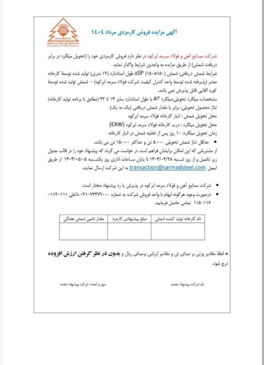 از مشتریانی که این امکان برایشان فراهم است درخواست میگردد که پیشنهاد خود را در قالب جدول(تصویر) تکمیل و از روز شنبه 1404/04/28 تا پایان ساعت اداری روز یکشنبه 1404/05/05 از طریق ایمیل transaction@sarmadsteel.com به این شرکت ارسال نمایند.