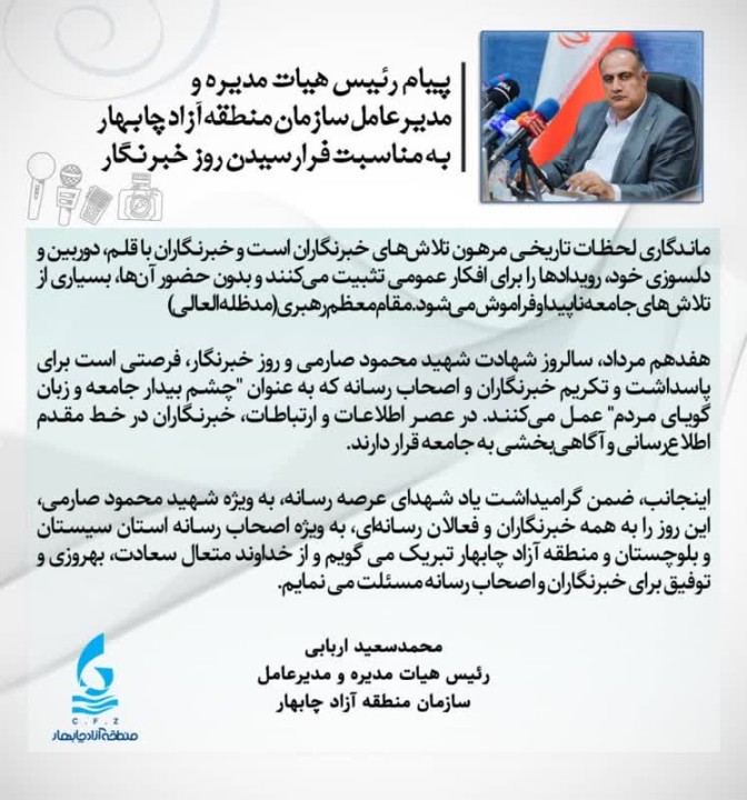 پیام رئیس هیأت مدیره و مدیرعامل سازمان منطقه آزاد چابهار به مناسبت روز خبرنگار