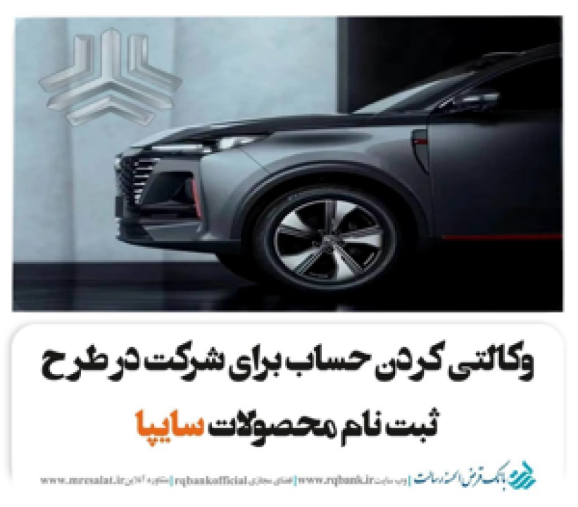 مشتریان بانک قرض الحسنه رسالت می توانند جهت ثبت نام در طرح جدید پیش فروش محصولات سایپا درخواست وکالتی نمودن حساب خود را از طریق سامانه پیشخوان مجازی رسالت به آدرس اینترنتی pishkhan.rqbank.ir به صورت غیرحضوری ثبت نمایند.