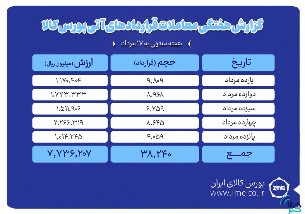 در هفته گذشته 38 هزار و 240 قراردادآتی به ارزش بالغ بر 773 میلیارد تومان منعقد شد.در هفته گذشته بیشترین ارزش معامله به روز 14مرداد ماه اختصاص یافت به طوری که در این روز 8 هزار و 645 قرارداد منعقد شد و ارزش معاملات نیزبه 226 میلیارد تومان رسید.