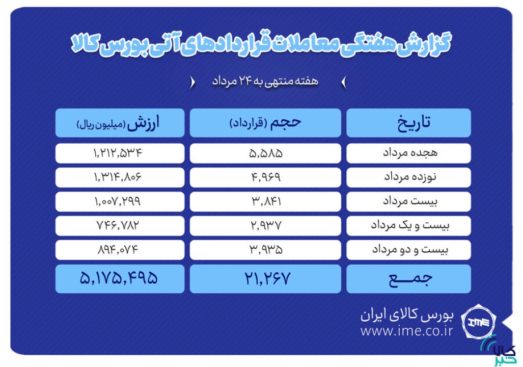 بررسی روند معاملات قراردادهای آتی بورس کالای ایران درهفته منتهی به ۲۴ مرداد نشان می دهد که در هفته گذشته ارزش معاملات بازار آتی به بیش از ۵۱۷ میلیارد تومان رسید.
