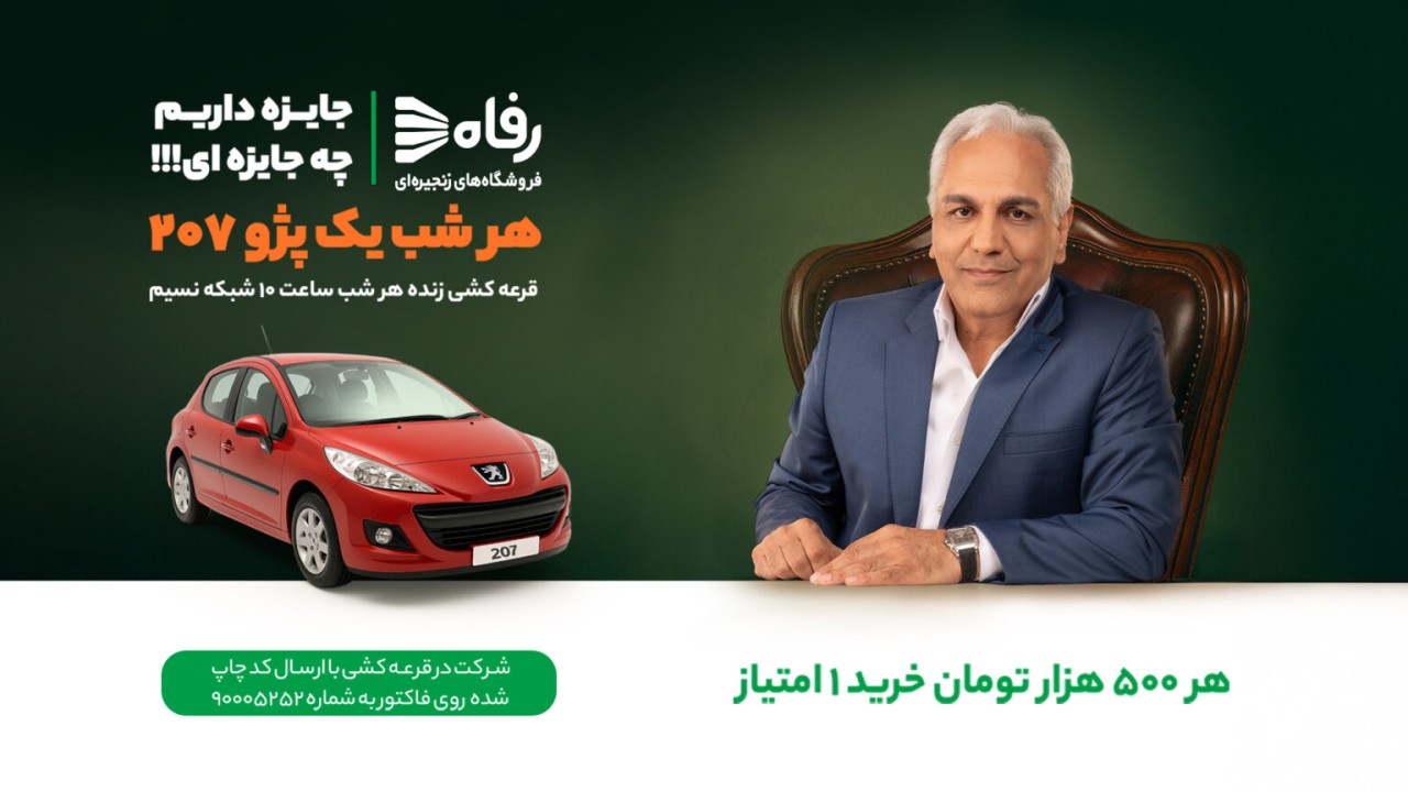 در این جشنواره مشتریان محترم رفاه میتوانند با خرید از فروشگاههای رفاه سراسر کشور و ارسال کد درجشده روی فاکتور خرید به شماره 90005252 شانس خود را برای برنده شدن یک دستگاه پژو 207 افزایش دهند.