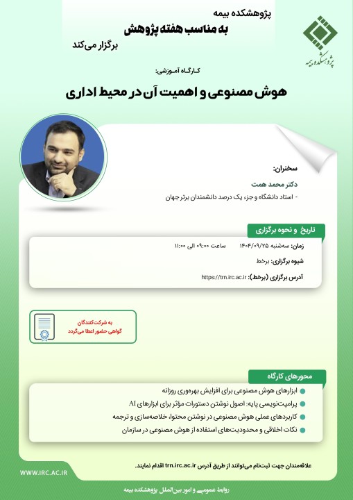 پژوهشکده بیمه به مناسبت هفته پژوهش، کارگاه آموزشی «هوش مصنوعی و اهمیت آن در محیط اداری» را با ارائه محمد همت، استاد دانشگاه و از یک درصد دانشمندان برتر جهان، روز سه‌شنبه ۲۵ آذر ۱۴۰۴ از ساعت ۹ تا ۱۱ به‌صورت برخط برگزار می‌کند.